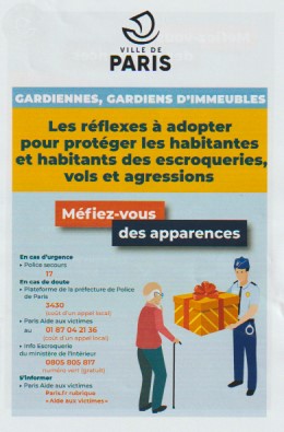 Ces dépliants édités par la Mairie de Paris avec la Police Municipale donnent un certain nombre de conseils à nos gardiennes et gardiens d'immeubles, mais aussi à travers eux aux locataires.